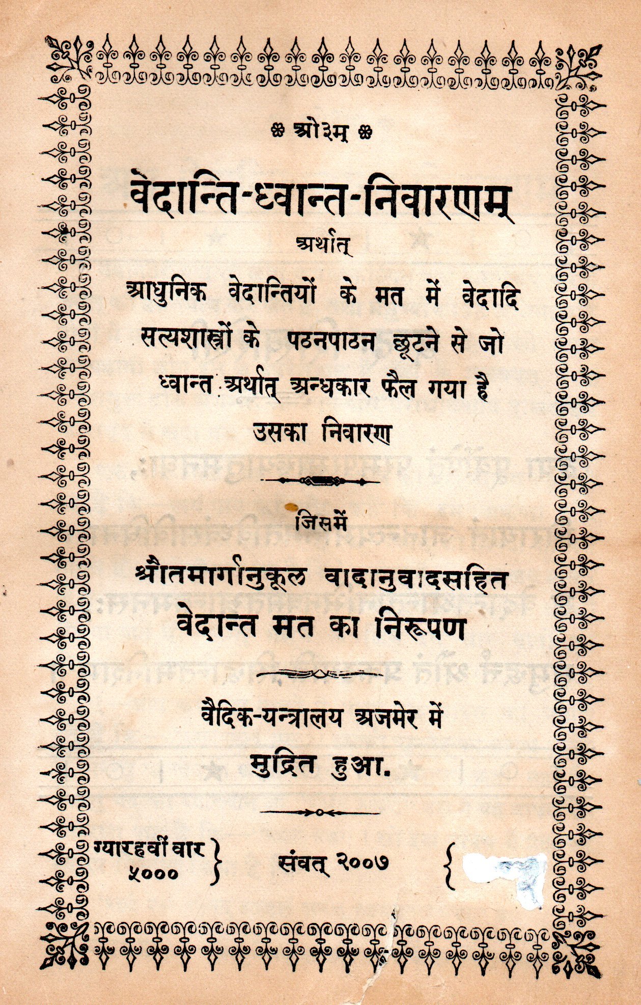 “Vedanti-Dhwant-Nivaranam” is one of the most profound philosophical works of Maharshi Dayanand Saraswati,